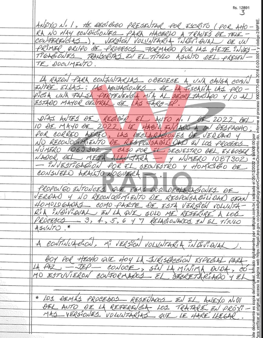 En el documento conocido en integridad por La W, asegura que nunca perteneció al secretariado de las Farc y/o a su Estado Mayor. Desconoce responsabilidad por casos como el de Alan Jara, Consuelo Araújo y Jorge Géchem.