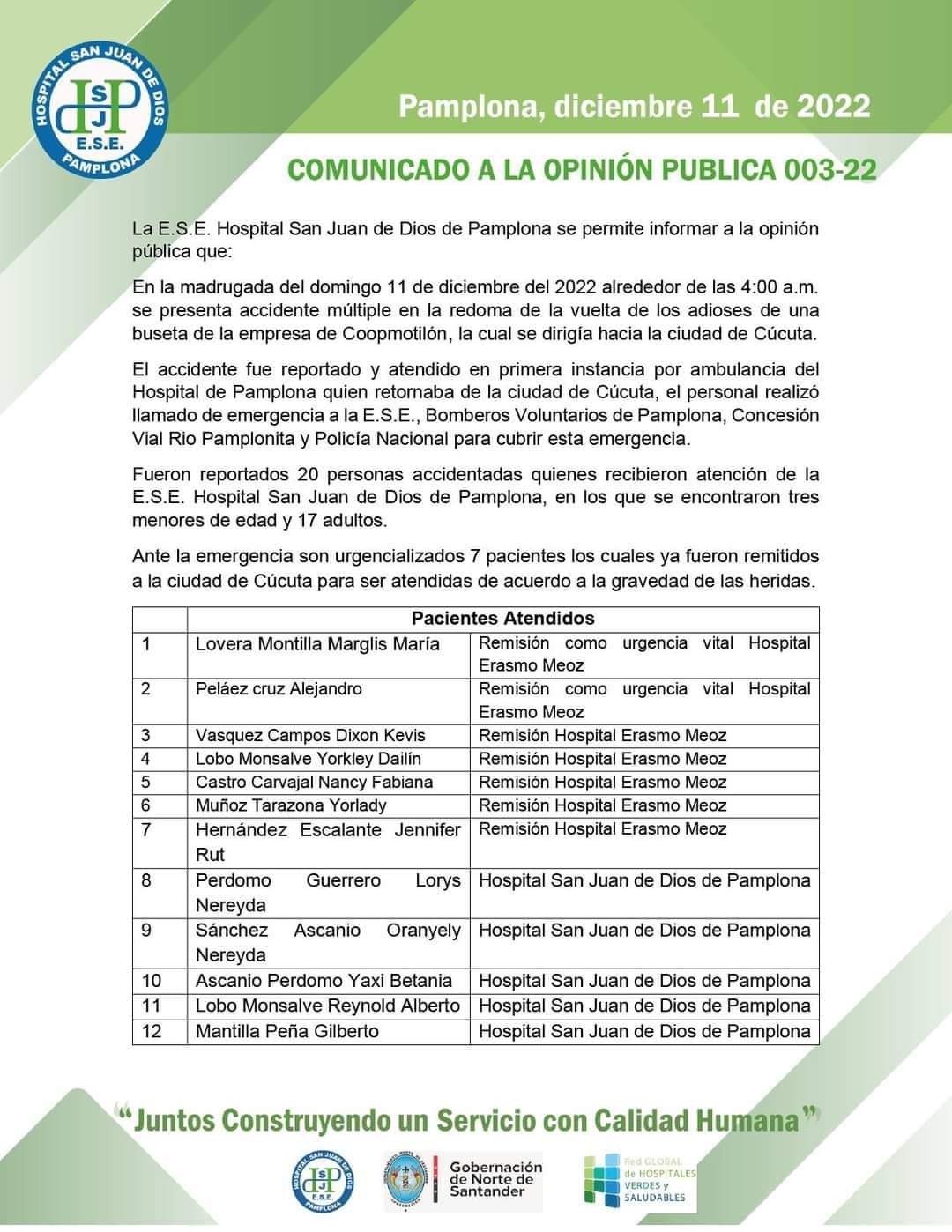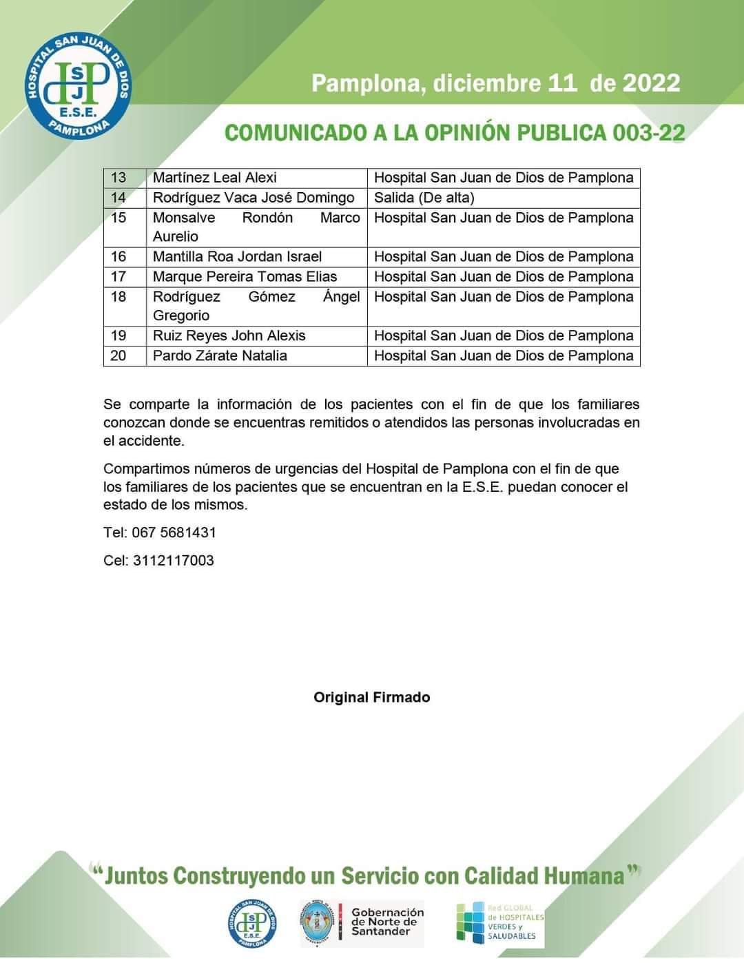Por su parte la E.S.E. Hospital San Juan de Dios de Pamplona hizo pública la lista de heridos en el accidente con el fin de que sus familiares conozcan dónde están siendo atendidos.