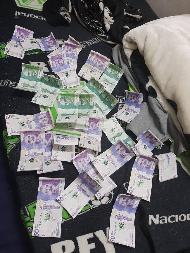 En las imágenes se observa fajos de billetes de 100 mil y 50 mil pesos, cajas de aguardientes, celulares y cigarrillos de marihuana.