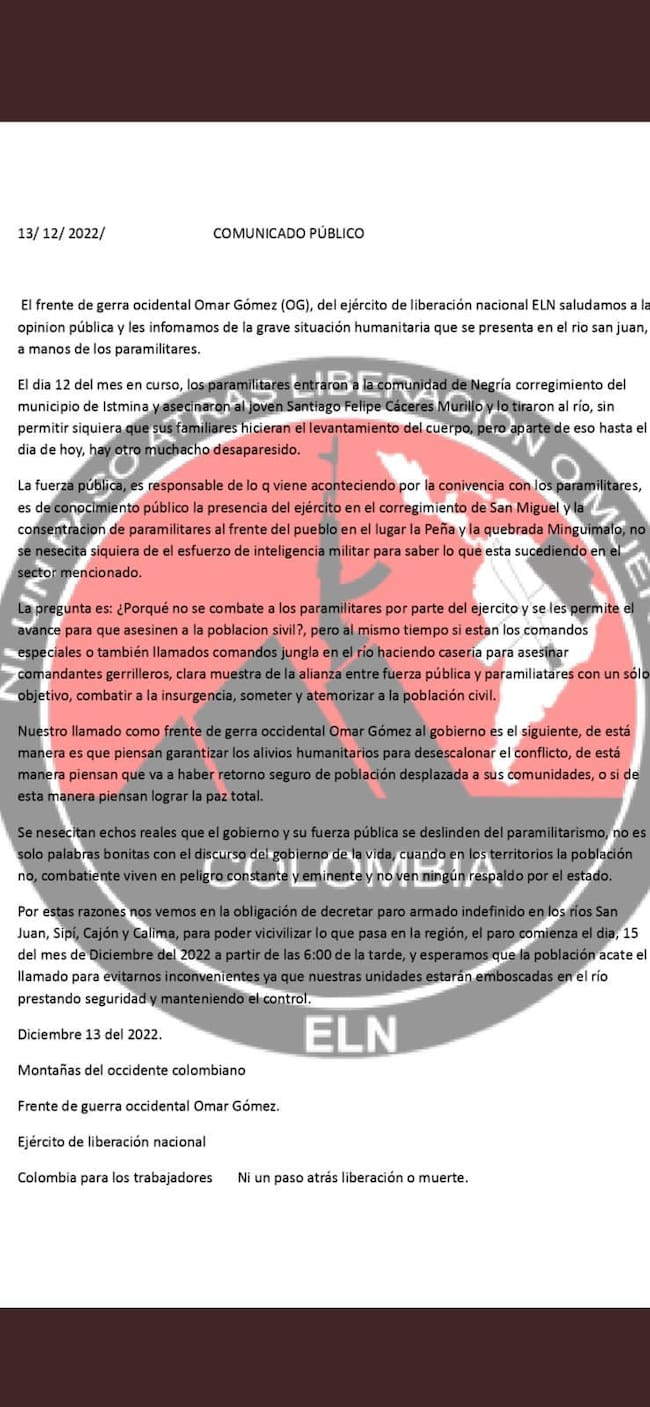 En medio de las conversaciones de paz que se adelantan con la guerrilla de ELN en Venezuela, se conoció en las últimas horas un comunicado por parte del Frente de Guerra Occidental en donde toma la decisión de decretar un paro armado luego, dicen ellos, de la incursión armada del Clan del Golfo en la comunidad de Negría en la noche del martes.
