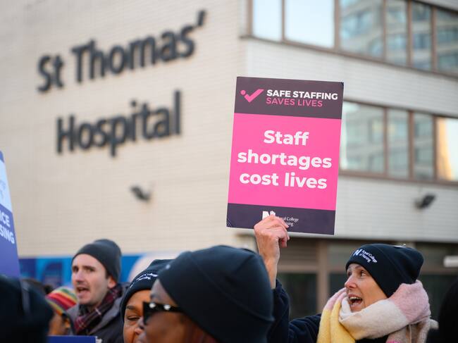 Enfermeras y simpatizantes se reúnen para manifestarse frente al hospital ST Thomas en Westminster el 15 de diciembre de 2022 en Londres, Inglaterra. / LEON NEAL