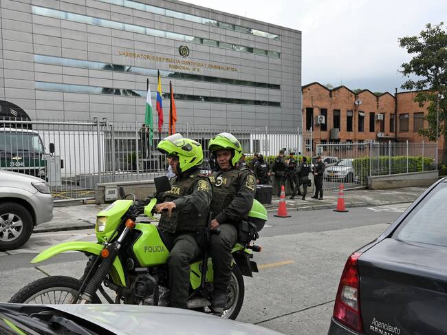 Oficiales de policía pasan en una motocicleta mientras otros montan guardia en Medellín. Vía Getty Images / JOAQUIN SARMIENTO