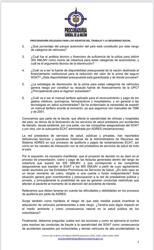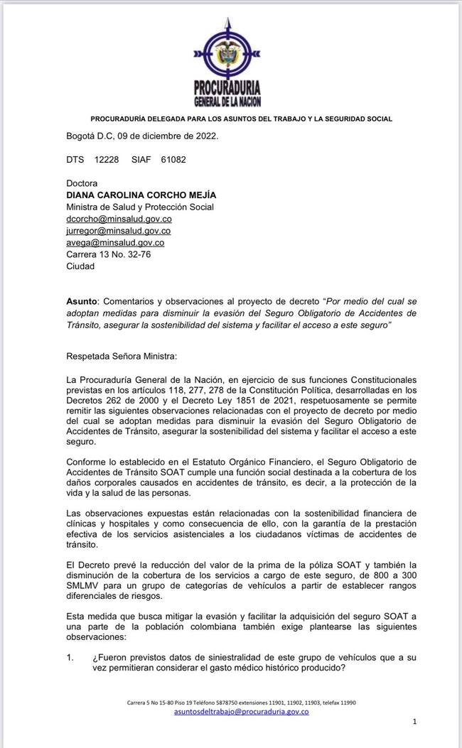Frente a este proyecto la Procuraduría envió una carta a la ministra de Salud Carolina Corcho en donde le hace una serie de cuestionamientos sobre cómo el descuento al SOAT puede llegar a afectar la sostenibilidad del sistema de salud a la hora de la atención del accidente de tránsito.