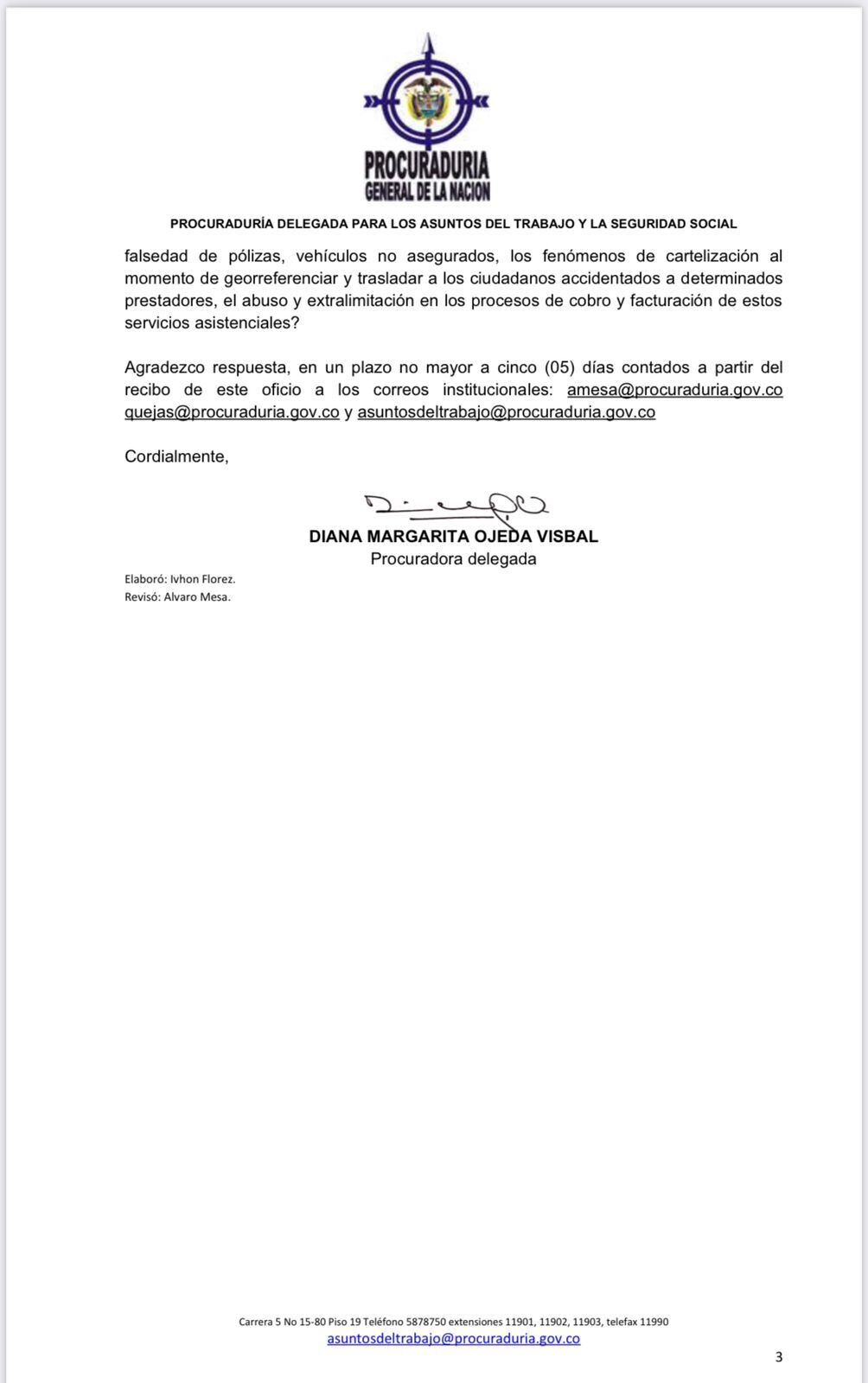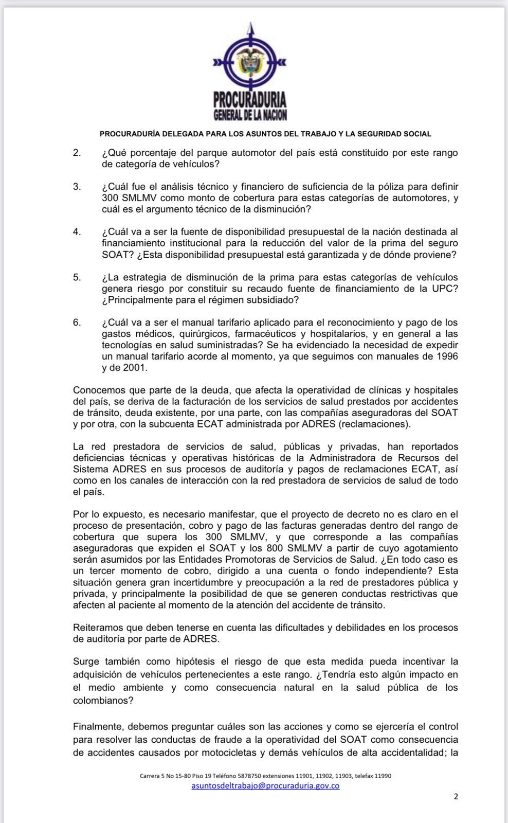 En el documento la procuradora delegada Diana Margarita Ojeda, pide a la ministra aclarar si fueron previstos datos de siniestralidad y si se consideraron los gastos médicos. Además pide explicar cuál fue el análisis técnico y financiero de suficiencia de la póliza para definir 300 SMLMV como monto de cobertura para estas categorías de automotores, y cuál es el argumento técnico de la disminución.