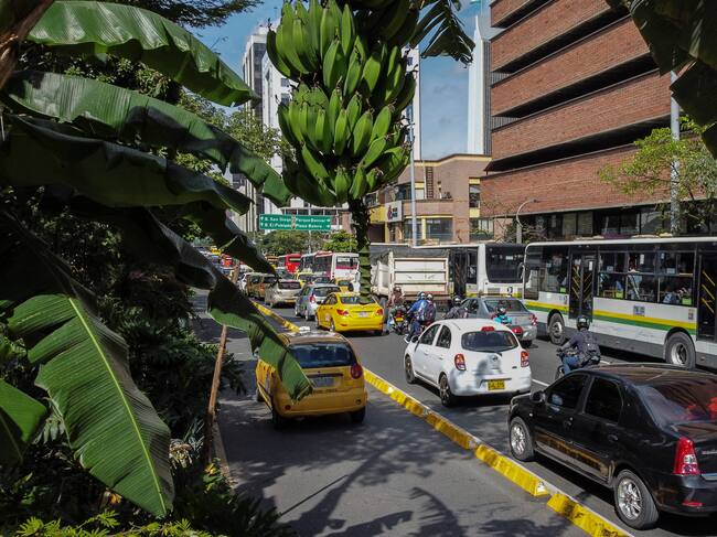 Automóviles pasan junto a un plátano verde en la Avenida Oriental en el centro de Medellín, Colombia. Vía Getty Images / JOAQUIN SARMIENTO