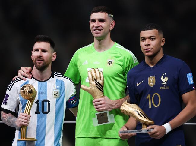 Lionel Messi, 'Dibu' Martínez y Kylian Mbappé. (Photo by Alex Livesey - Danehouse/Getty Images) / Alex Livesey - Danehouse