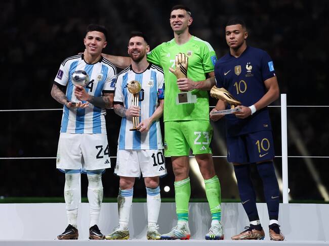 Enfo Fernández, Lionel Messi, Emiliano Martínez y Kylian Mbappé. (Photo by Alex Livesey - Danehouse/Getty Images) / Alex Livesey - Danehouse