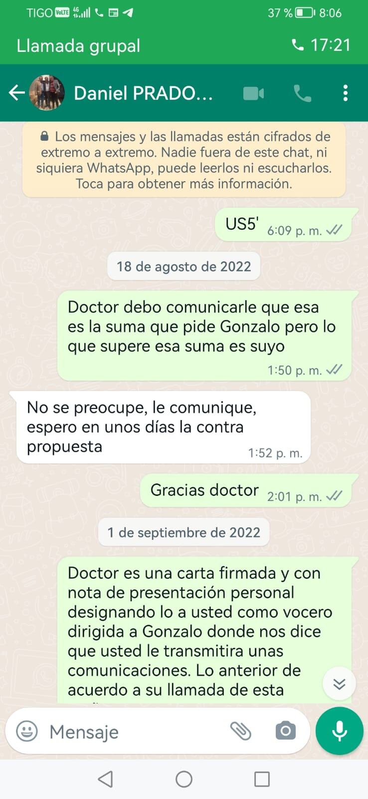 Por lo demás existe una comunicación de Whatsapp cuya copia conocí tanto por Daniel Prado como por Gonzalo Guillén donde otro abogado, el doctor José Luis Mozo representante de Guillén para este trámite, escribe dos mensajes de whatsapp.