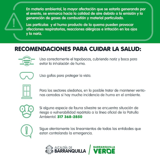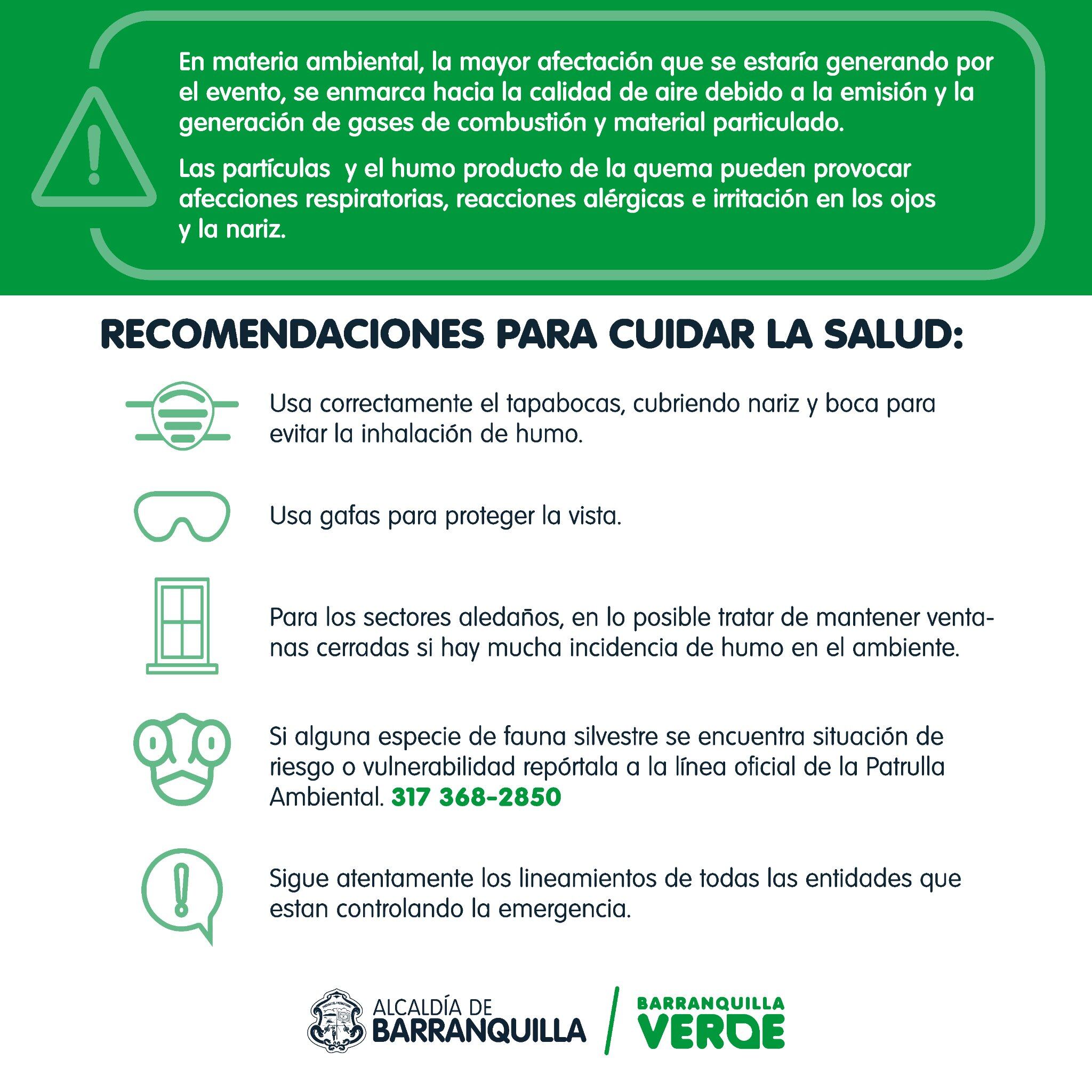 Entre las recomendaciones para la ciudadanía, desde la Alcaldía de Barranquilla se encuentra el uso correcto de tapabocas, mantener cerradas puertas y ventanas de viviendas en sectores aledaños y el uso de gafas para proteger la vista.