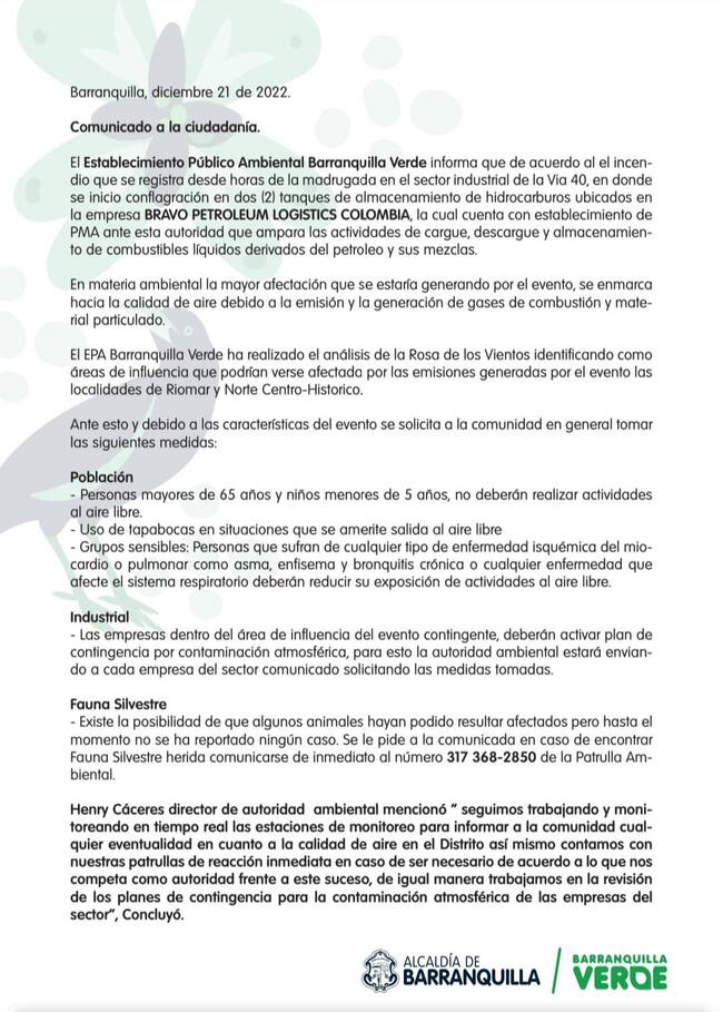 Según las declaraciones entregadas por el alcalde Jaime Pumarejo en el Puesto de Mando Unificado, PMU, “es una situación que no está contrada, en la cual estamos mitigando los riesgos para primero preservar la vida y segundo, minimizar el impacto de los activos de las empresas aledañas, de las familias que tiene activos aquí cercanos, pero primero la vida y luego la propiedad”.