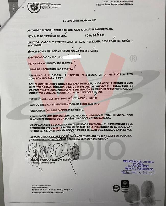 El Instituto Nacional Penitenciario y Carcelario (Inpec) confirmó que este miércoles quedaron en libertad Santiago Márquez Charris y Adriana Esperanza Bermeo, integrantes de la ‘Primera Línea’, que se convertirán en ‘gestores de paz’.