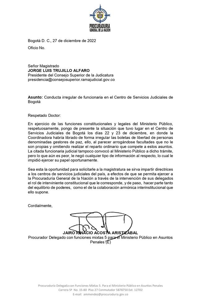 “Tampoco se les compartió información para actuar en esos casos, y que la persona que firmó las órdenes de libertad, la Coordinadora del Centro de Servicios Judiciales del complejo judicial de Paloquemao, en Bogotá, no tendría la competencia para otorgarlas”, precisó el Ministerio Público.