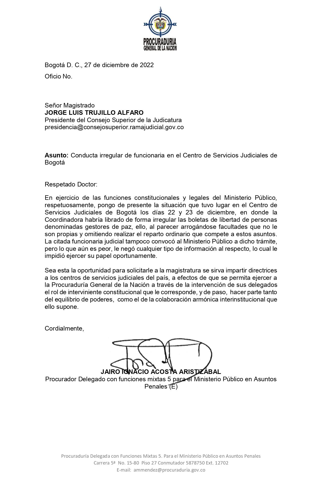 “Tampoco se les compartió información para actuar en esos casos, y que la persona que firmó las órdenes de libertad, la Coordinadora del Centro de Servicios Judiciales del complejo judicial de Paloquemao, en Bogotá, no tendría la competencia para otorgarlas”, precisó el Ministerio Público.
