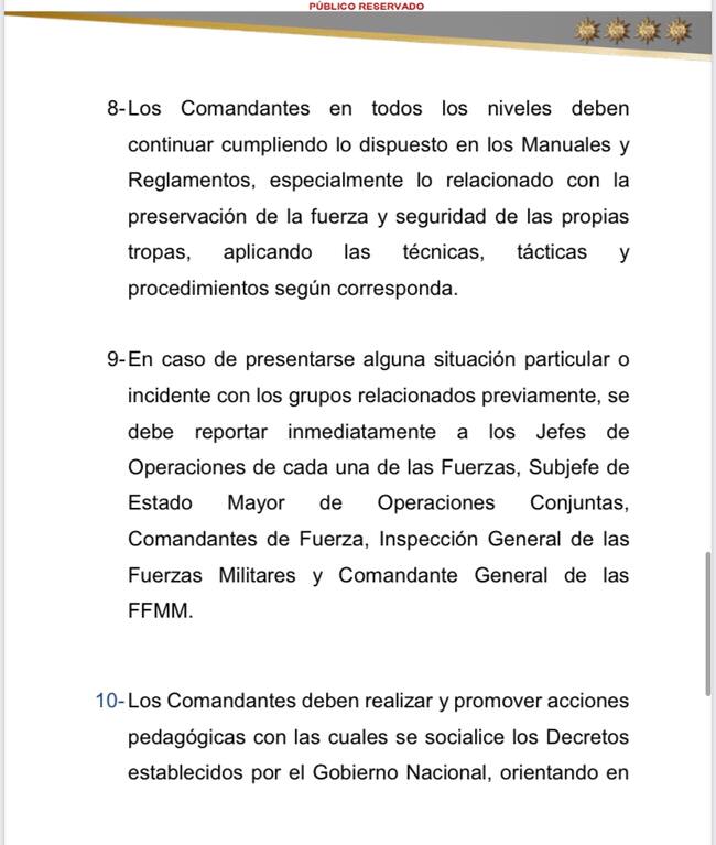 También se agrega que “en caso de presentarse alguna situación particular o incidente con los grupos relacionados previamente, se debe reportar inmediatamente a los Jefes de Operaciones de cada una de las Fuerzas, Subjefe de Estado Mayor de Operaciones Conjuntas, Comandantes de Fuerza, Inspección General de las Fuerzas Militares y Comandante General de las FFMM”.