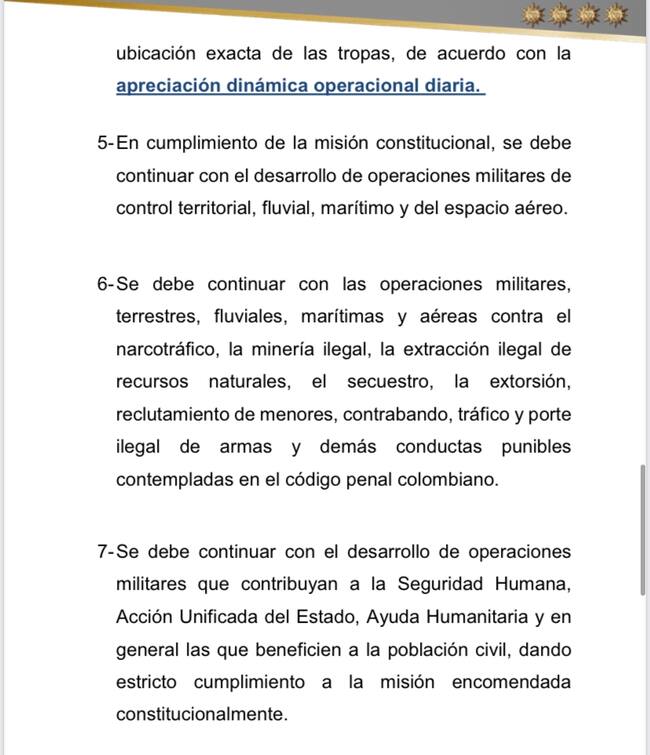 “Se debe continuar con las operaciones militares, terrestres, fluviales, marítimas y aéreas contra el narcotráfico, la minería ilegal, la extracción ilegal de recursos naturales, el secuestro, la extorsión, reclutamiento de menores, contrabando, tráfico y porte ilegal de armas y demás conductas punibles contempladas en el código penal colombiano”.