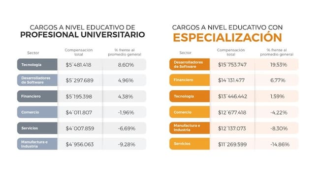 De acuerdo con esta situación, elempleo.com y la consultora Talent Advisor implementaron la ‘Encuesta Punto Salarial 2022-2023′ para determinar cuáles son los mejores empleos pagos en el país, conforme a las estadísticas publicadas se concluyó que: el sector financiero y tecnológico dejan grandes remuneraciones para los técnicos, tecnólogos, profesionales y personas con especialización.