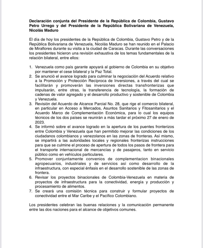 Una hora después de terminado el encuentro se conoció la declaración conjunta cuyo primer punto es el compromiso del gobierno de Maduro con Gustavo Petro “en su objetivo por mantener el cese bilateral y la Paz Total”. Esto luego de la polémica generada por el anuncio de Petro sobre un cese al fuego a partir del 1 de enero que el ELN no suscribió.