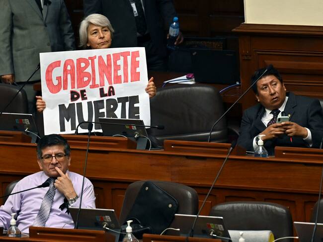 La diputada peruana Margot Agüero, del partido de izquierda Perú Libre, sostiene un cartel que dice "Gabinete de la muerte" durante la sesión plenaria del Congreso, en Lima, el 10 de enero de 2023. -Foto de CRIS BOURONCLE/POOL/AFP vía Getty Images. / CRIS BOURONCLE