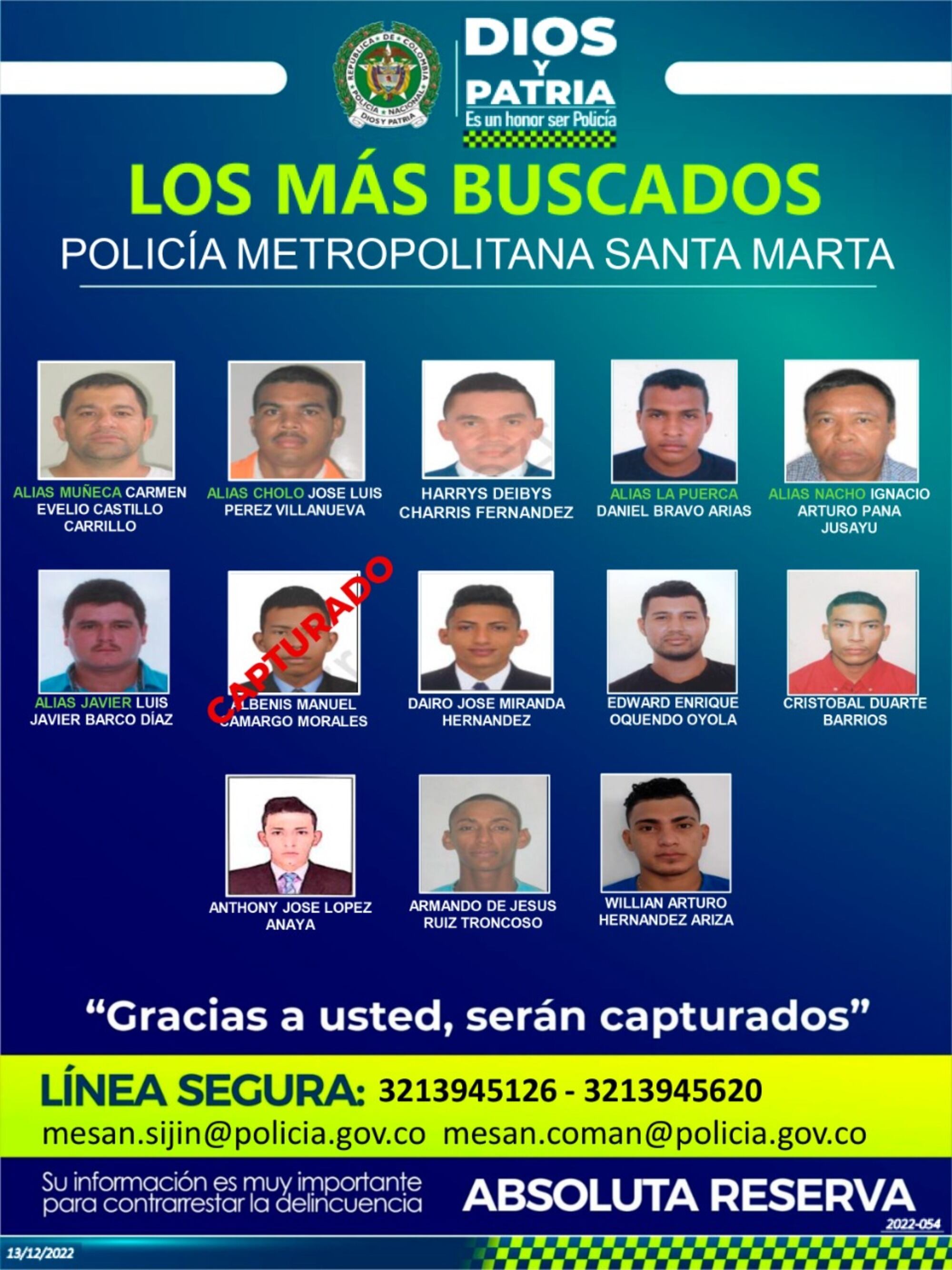 Por otro lado, el cartel de los más buscados en Santa Marta ya tiene rostros para que la ciudadanía los pueda identificar y los denuncie con total reserva. Cabe mencionar que la Policía Metropolitana de Santa Marta recibió críticas a nivel nacional por difundir un cartel de siluetas que no decía nada.