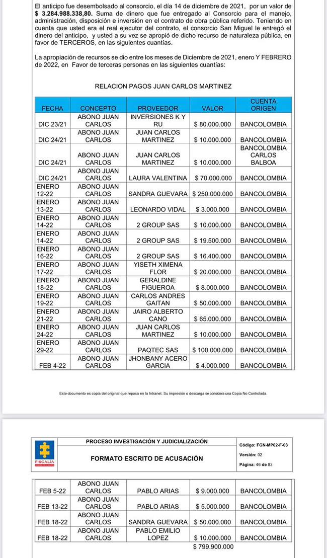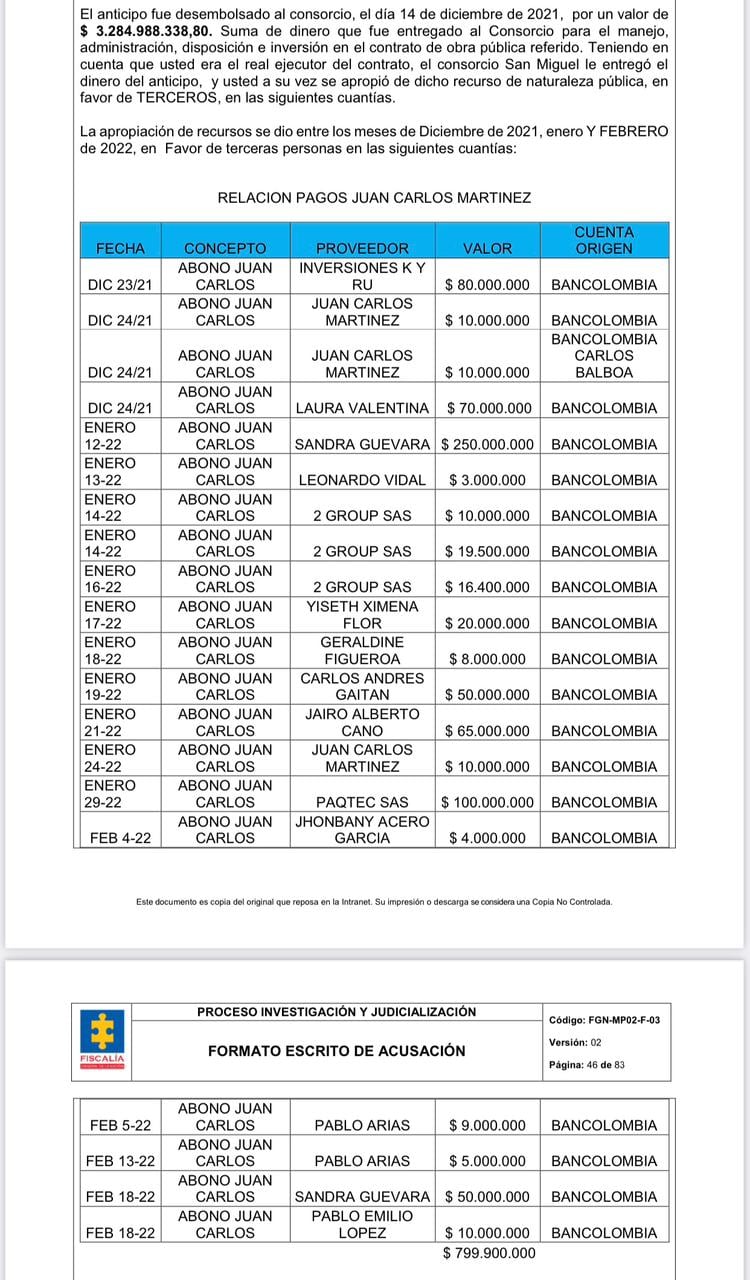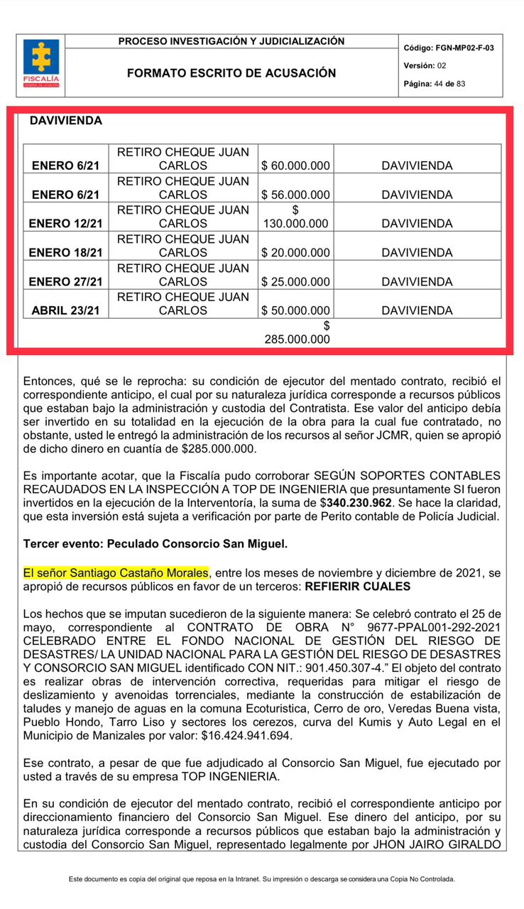 En otro contrato por $16.400 millones celebrado entre la Unidad de Gestión del Riesgo y el Consorcio San Miguel, que finalmente fue ejecutado también por Top Ingeniería, se recibió un anticipo de $3.285 millones, de los cuales $800 millones fueron a parar a la cuenta de Martínez.