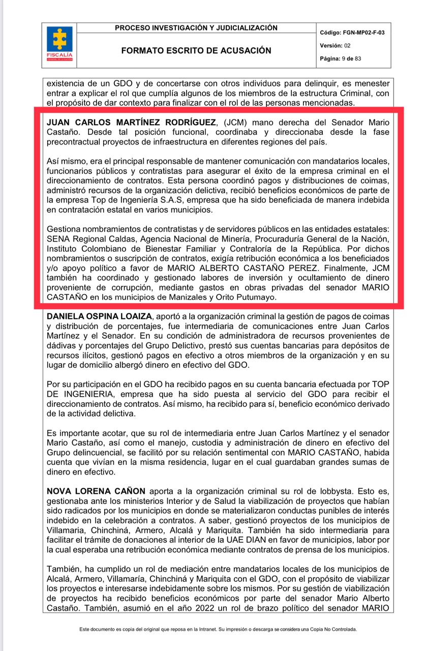 Sobre Martínez también dice que coordinó y gestionó labores de inversión y ocultamiento de dinero proveniente de corrupción, mediante gastos en obras privadas del senador Mario Castaño en los municipios de Manizales y Orito Putumayo.