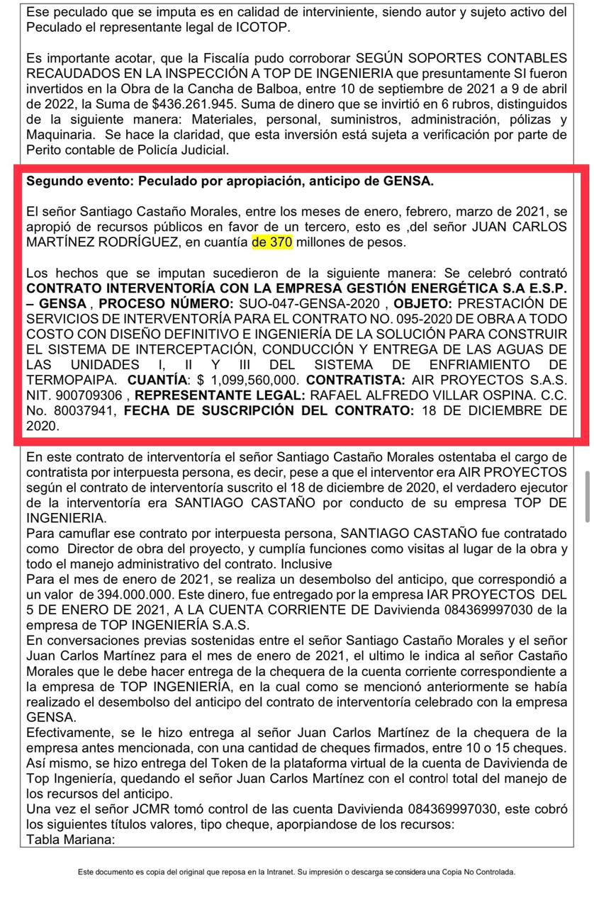 Por ejemplo, otro de los acusados, Santiago Castaño Morales, era quien -de acuerdo con el documento de la Fiscalía- entre los meses de enero, febrero y marzo de 2021, se habría apropiado de recursos públicos en favor de Juan Carlos Martínez Rodríguez, por 370 millones de pesos, en un contrato de Termopaipa.
