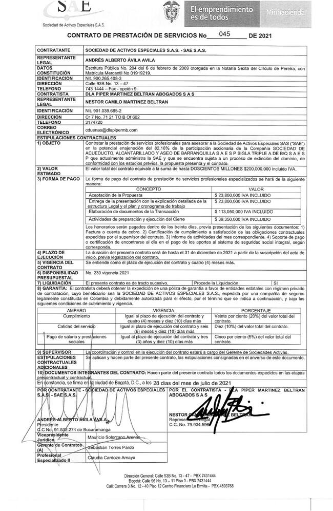 Otro punto que llama la atención con respecto a la enajenación de las acciones de la Triple A es un contrato por $200 millones que el entonces director de la SAE, Andrés Ávila, entregó a Néstor Camilo Martínez, hijo del exfiscal Néstor Humberto Martínez, con el fin de realizar una asesoría previa a la enajenación de dichas acciones, proceso que hoy está en vilo.