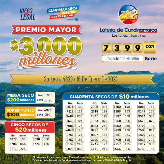 Este lunes 16 de enero de 2023 se jugó la Lotería de Cundinamarca con un premio mayor de 3.000 millones de pesos.
