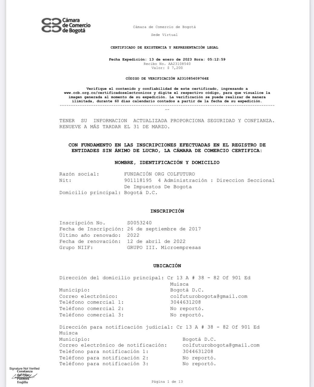 La Fundación Org Colfuturo, tiene su sede en la Cr 13 A # 38 - 82 Of 901, edificio Muisca en Bogotá. Su fecha de inscripción ante Cámara y Comercio fue 26 de septiembre de 2017 y su renovación 12 de abril de 2022, semanas antes de ser proponente para participar en la elaboración de concurso de méritos del Inpec.