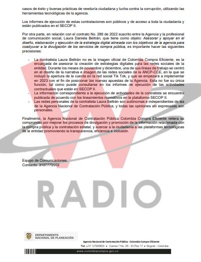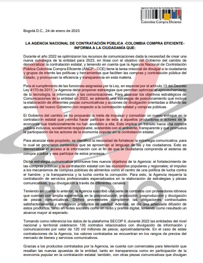 En el comunicado aclaran la contratación en materia de comunicación por 120.000 millones de pesos y el contrato de la influenciadora Lalis.