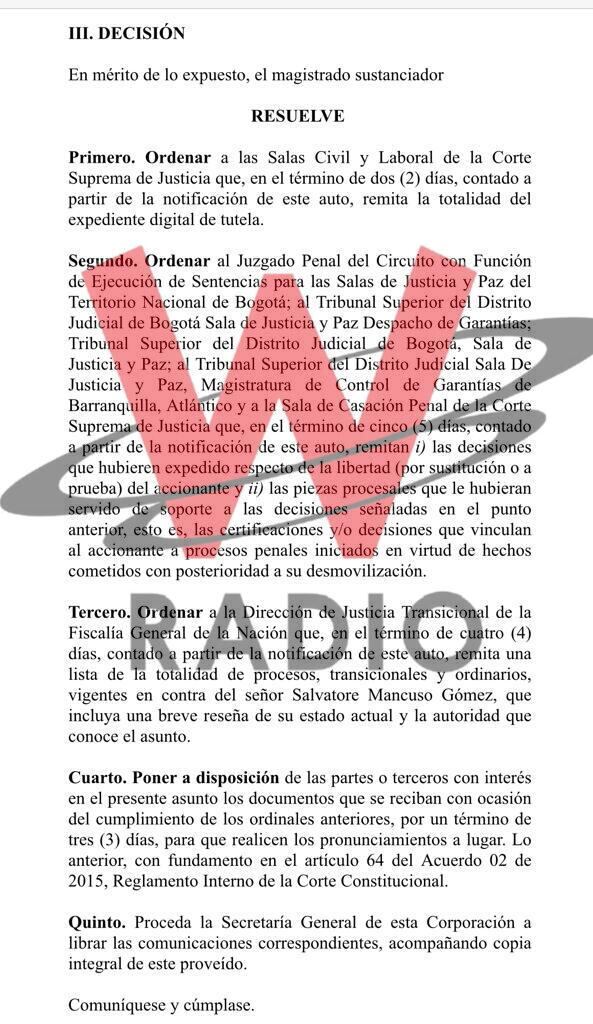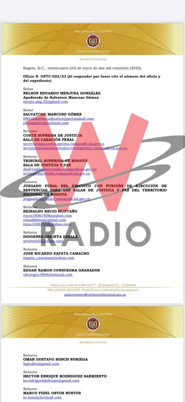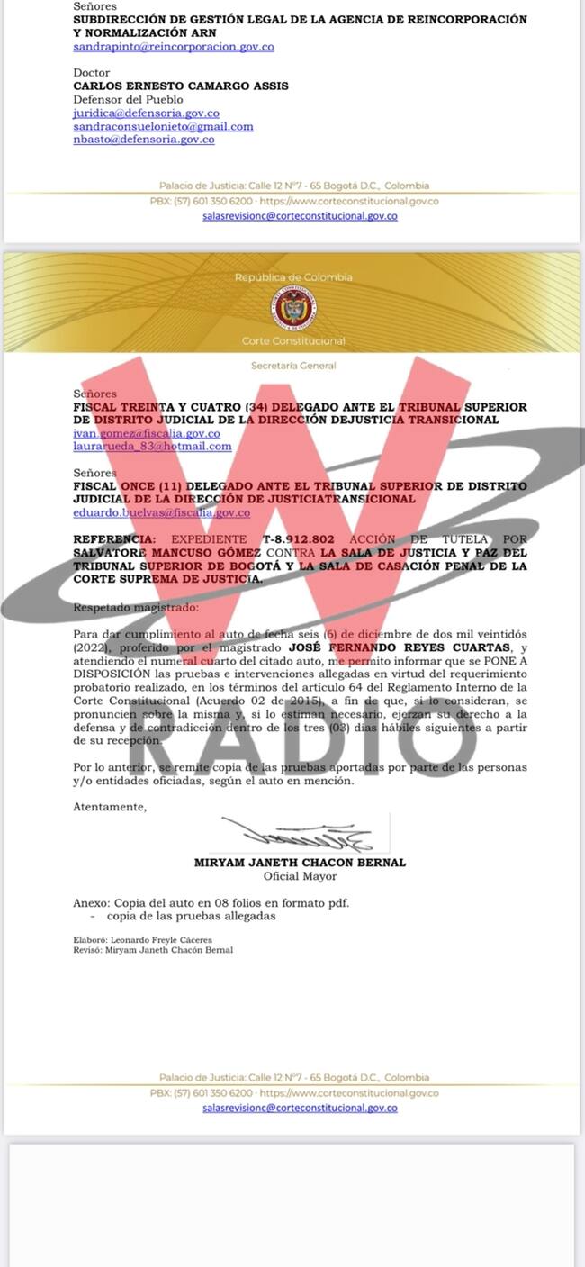 Finamente, La W Radio conoció que en este oficio con fecha del 24 de enero de 2023, la Corte Constitucional además de la notificación, ordena cumplir un auto del 6 de diciembre de 2022 con ponencia del magistrado José Fernando Reyes, del que también tuvimos acceso y le ordena a la Corte Suprema entregar el expediente completo, a los juzgados y tribunales de justicia y paz, que en 5 días remita todas las decisiones en contra de Mancuso, las piezas procesales y procesos penales iniciados luego de su desmovilización, también notifica a la Fiscalía y a las víctimas para que realicen algún pronunciamiento si así lo prefieren.