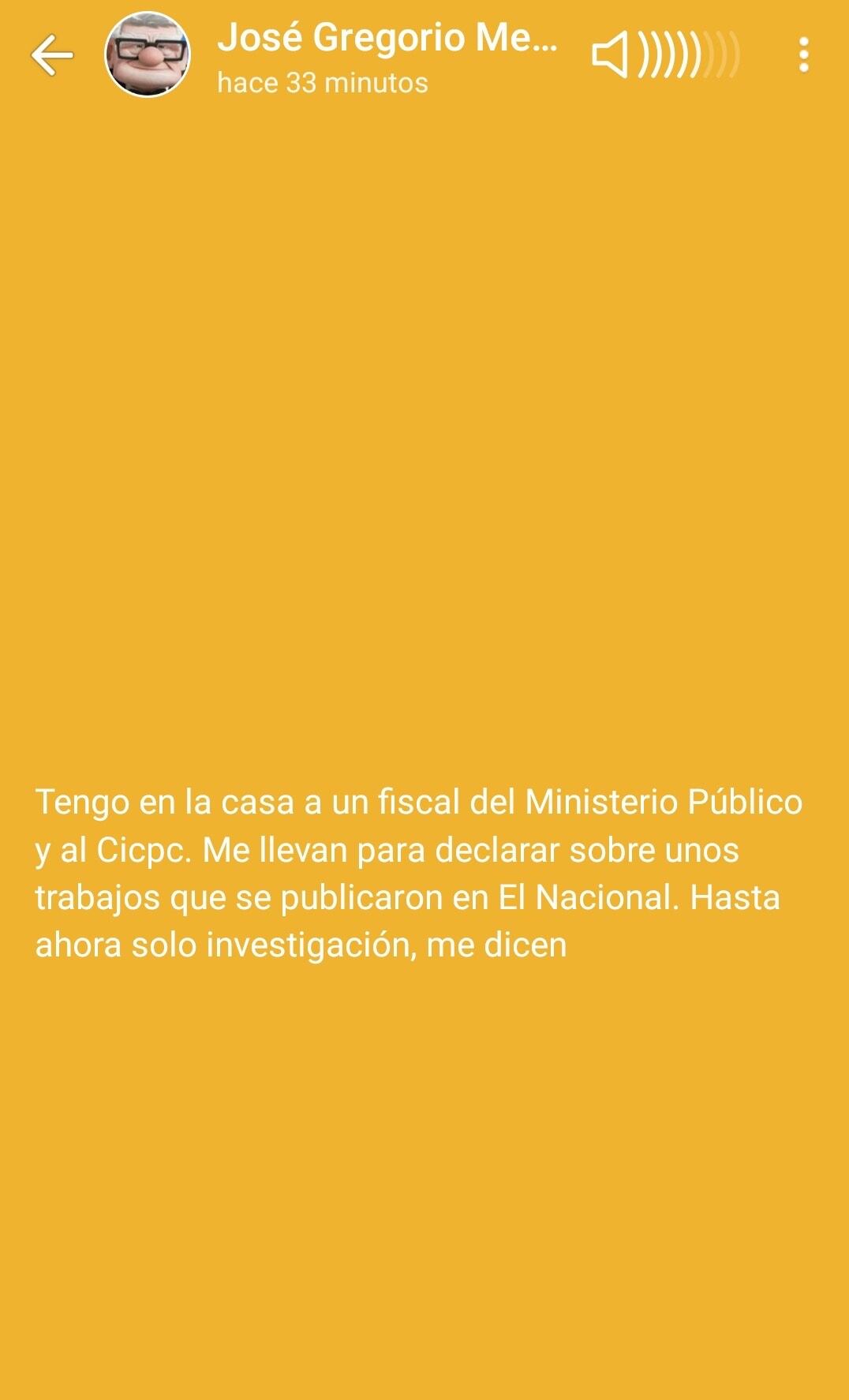“Tengo en la casa a un fiscal del Ministerio Público y al Cicpc. Me llevan para declarar sobre unos trabajos que se publicaron en El Nacional. Hasta ahora solo investigación, me dicen”.