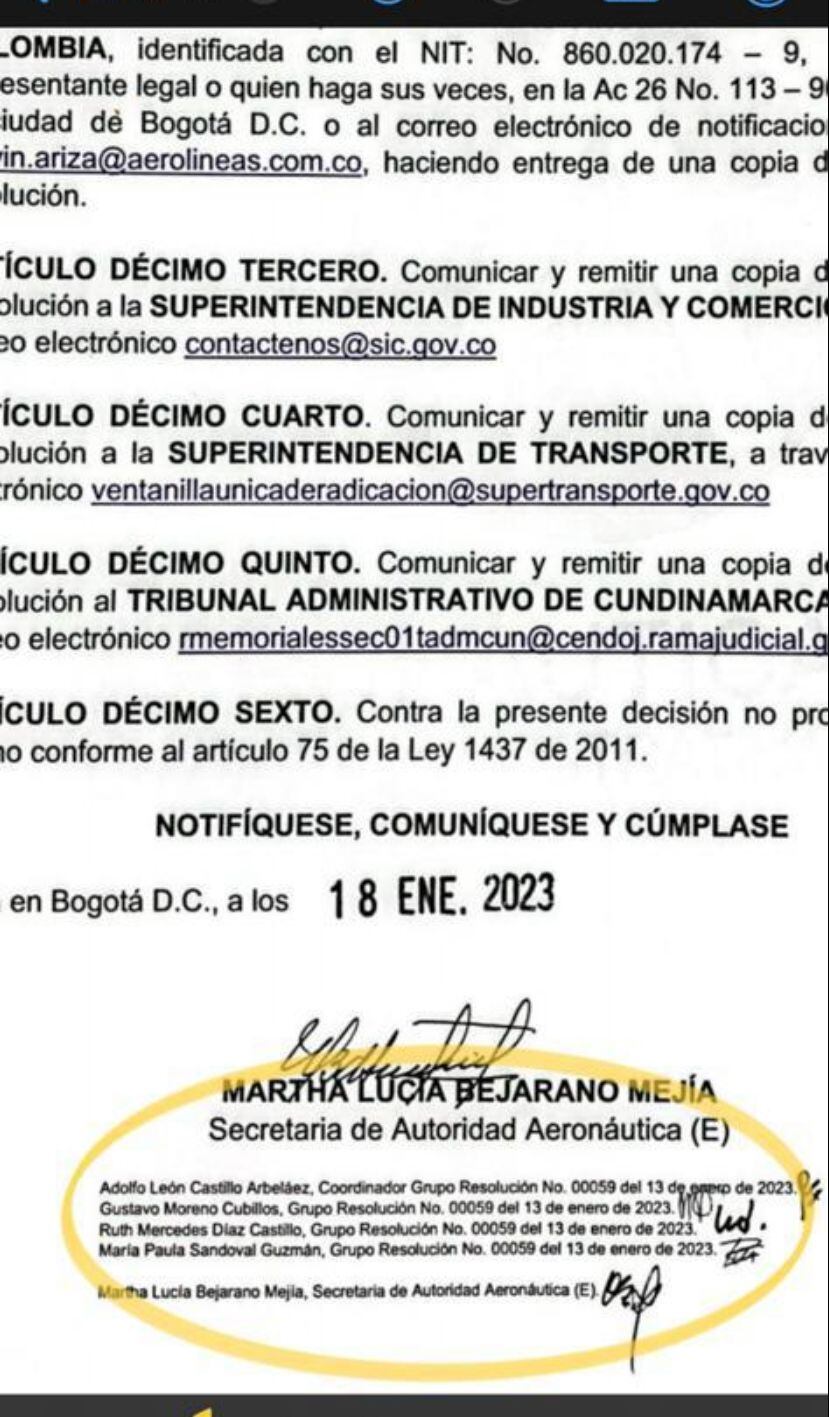 “Con base en el derecho fundamental al debido proceso, ha notificado a los operadores de Avianca, Viva Air y terceros interesados sobre la decisión adoptada en la Resolución 00079 del 18 de enero de 2023″, señala el comunicado.
