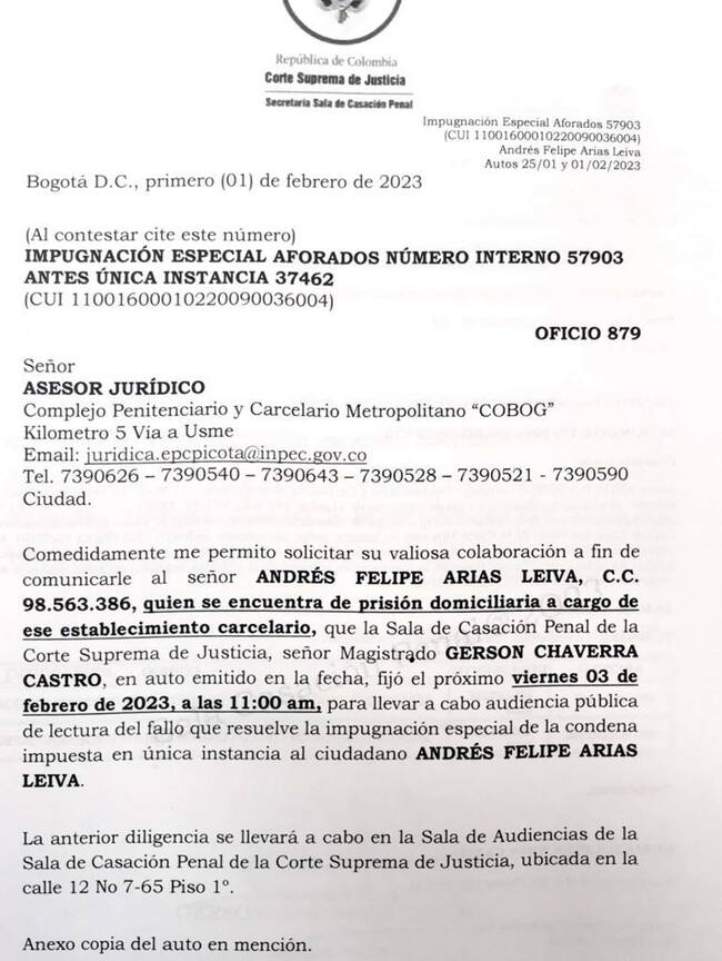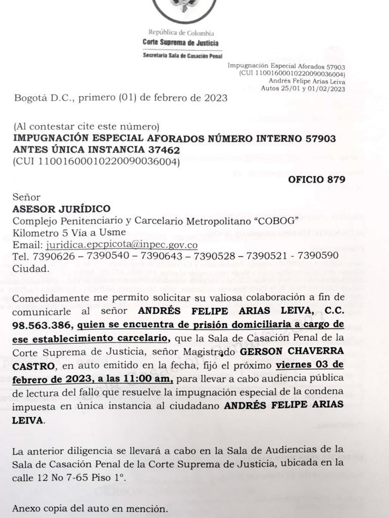 Mañana viernes 3 de febrero, a las 11:00 de la mañana, se realizará en la Sala de Audiencias del Palacio de Justicia la lectura de sentencia que resuelve la impugnación especial de doble conformidad, es decir, la sentencia definitiva, en el caso contra el exministro de Agricultura Andrés Felipe Arias.