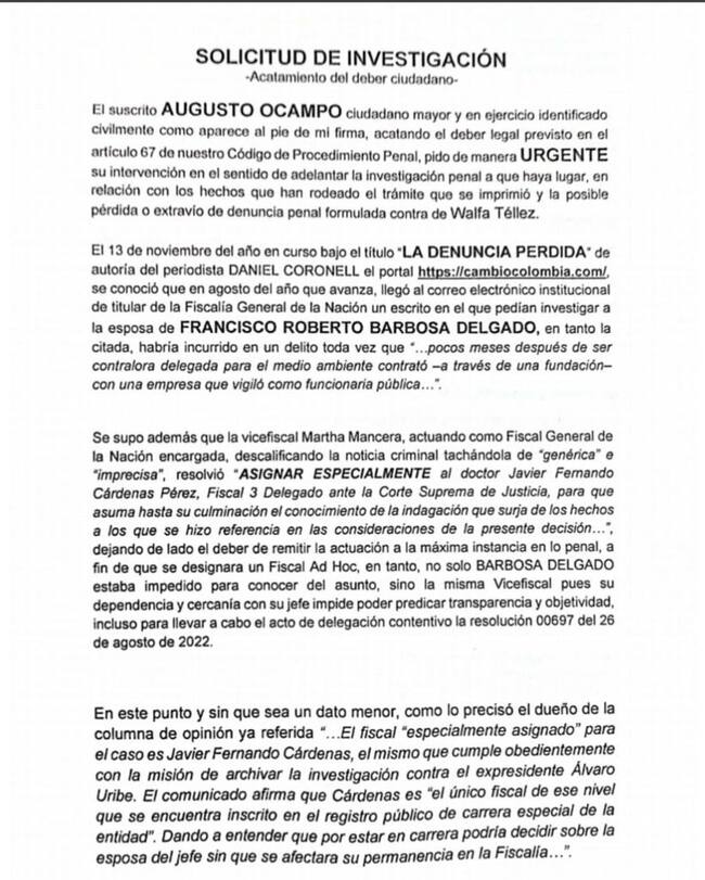 Ante esta situación, denunciada públicamente por mí, el abogado Augusto Ocampo envió un memorial a la Corte Suprema de Justicia en donde pedía que fueran investigados el fiscal Barbosa y la fiscal encargada Martha Mancera por la posible comisión del delito de prevaricato y daba cuenta, también, de que la denuncia está perdida dentro de la Fiscalía.
