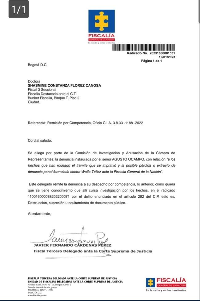 Sin embargo, hace unos días, el abogado denunciante Augusto Ocampo conoció un documento firmado por el fiscal delegado Javier Fernando Cárdenas en el que en el que remite la denuncia de Ocampo a una fiscal ante el CTI para que investigue la presunta “Destrucción, supresión u ocultamiento de un documento público”.