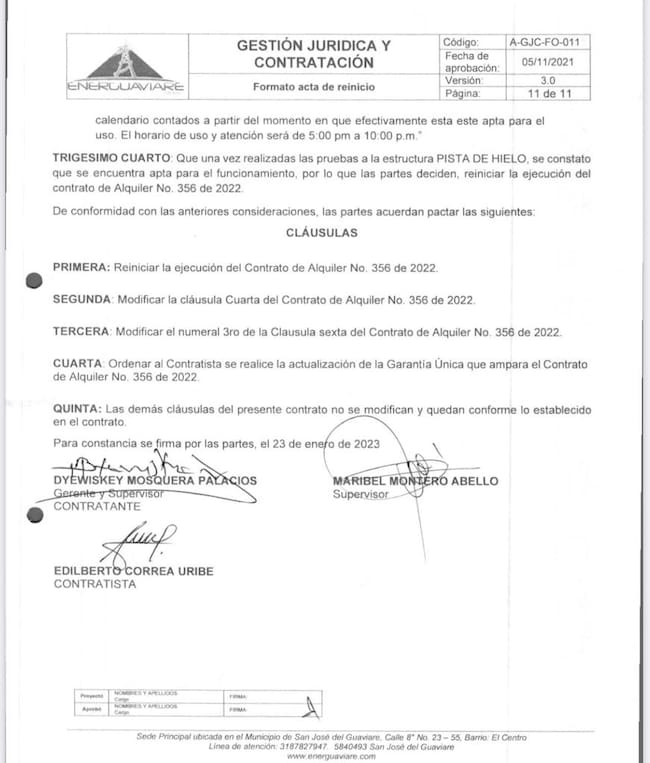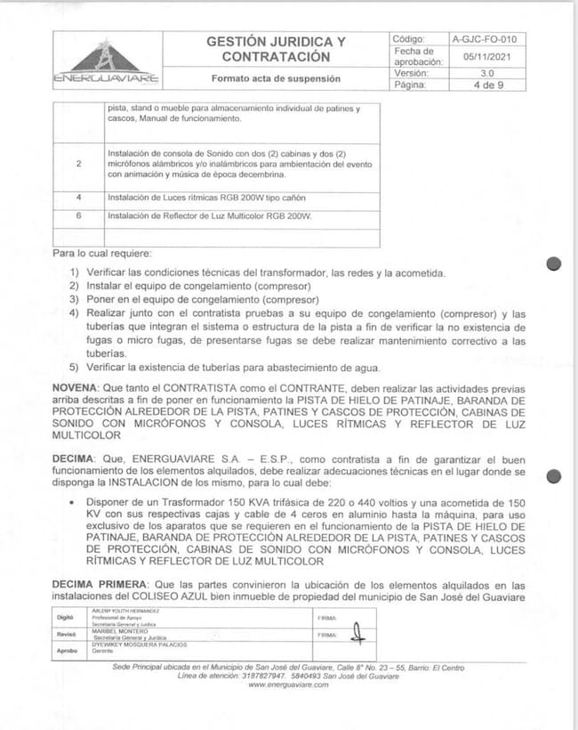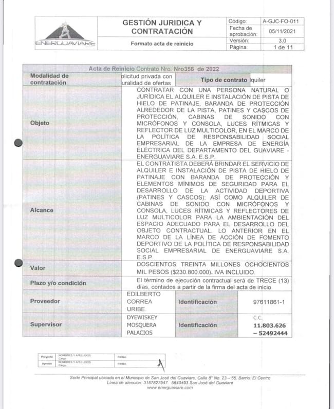 El 13 de diciembre se hizo una invitación privada para “contratar con una persona natural o jurídica el alquiler e instalación de pista de hielo de patinaje, baranda de protección alrededor de la pista, patines y cascos de protección, cabinas de sonido con micrófonos y consola, luces rítmicas y reflector de luz multicolor, en el marco de la política de responsabilidad social empresarial de Empresa de Energía Eléctrica del Departamento de Guaviare”.