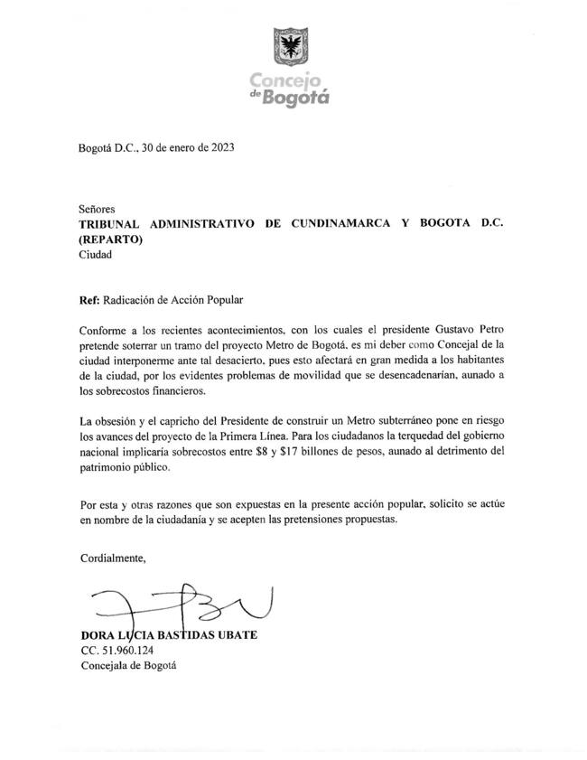La concejal Dora Lucía Bastidas interpuso ante el Tribunal Administrativo de Cundinamarca, una acción popular contra la Alcaldía de Bogotá y la nación para evitar que hagan más cambios al proyecto del metro de la capital de la República.