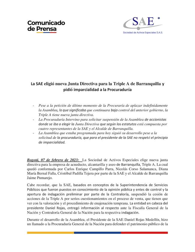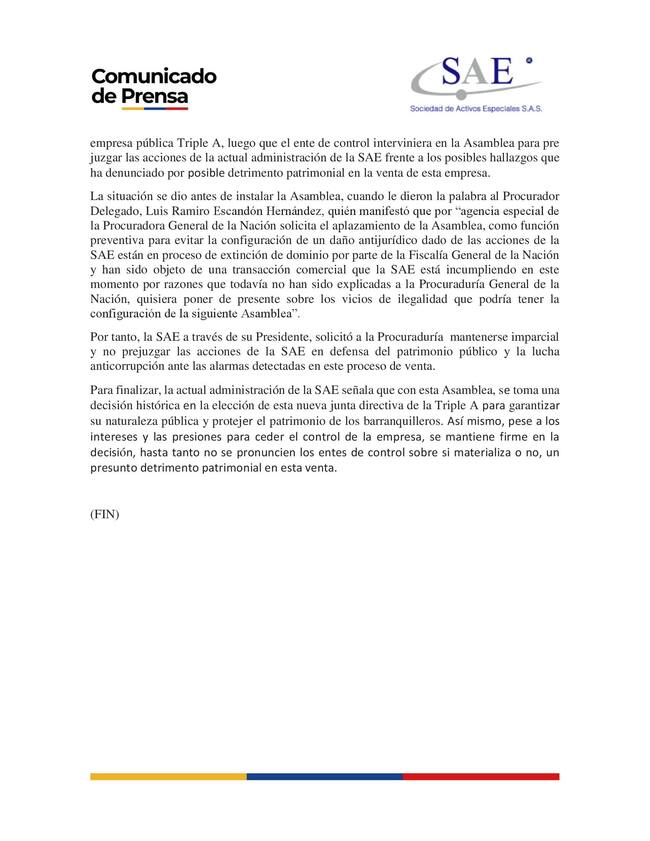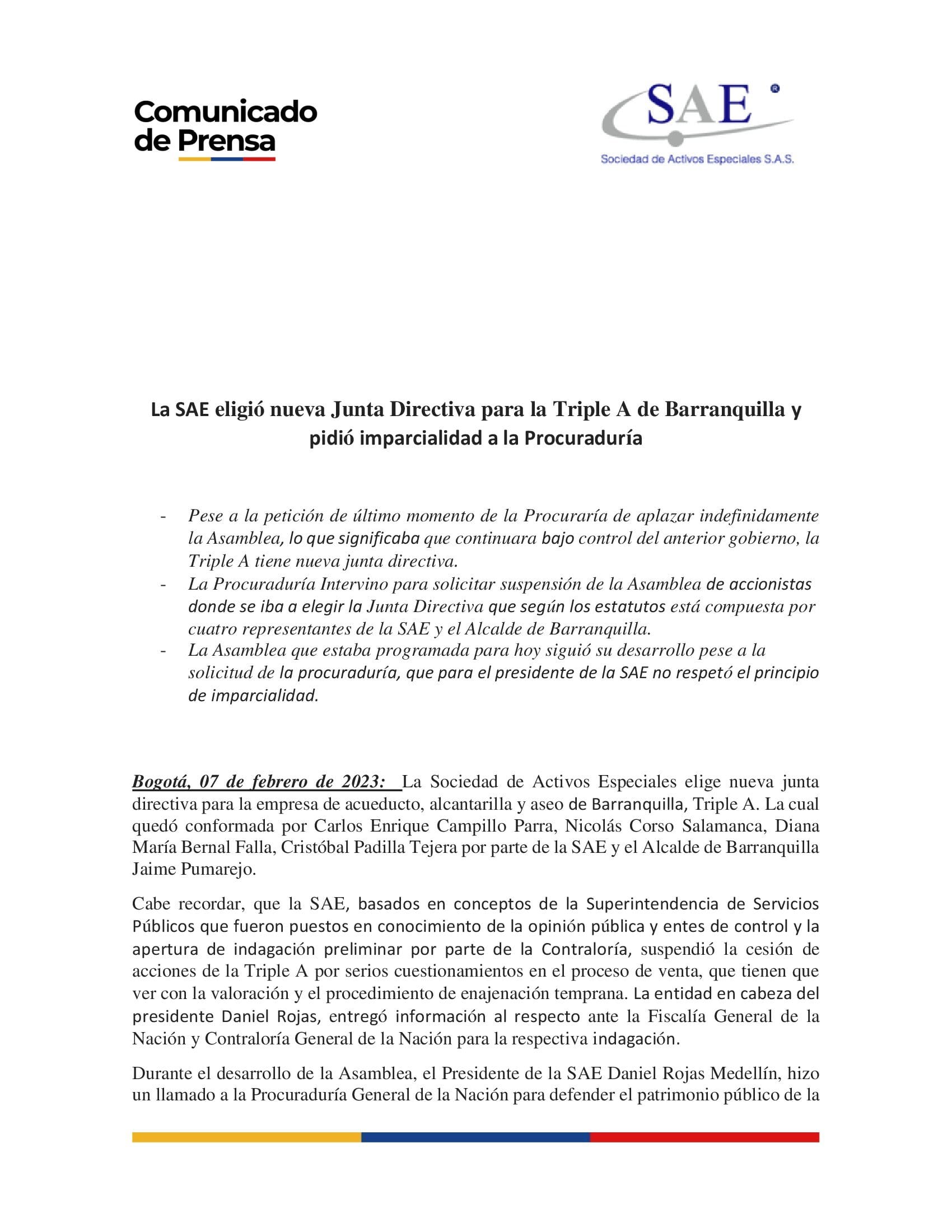 “Con esta Asamblea, se toma una decisión histórica en la elección de esta nueva junta directiva de la Triple A para garantizar su naturaleza pública y proteger el patrimonio de los barranquilleros. Así mismo, pese a los intereses y las presiones para ceder el control de la empresa, se mantiene firme en la decisión, hasta tanto no se pronuncien los entes de control sobre si materializa o no, un presunto detrimento patrimonial en esta venta”, afirmó la SAE.