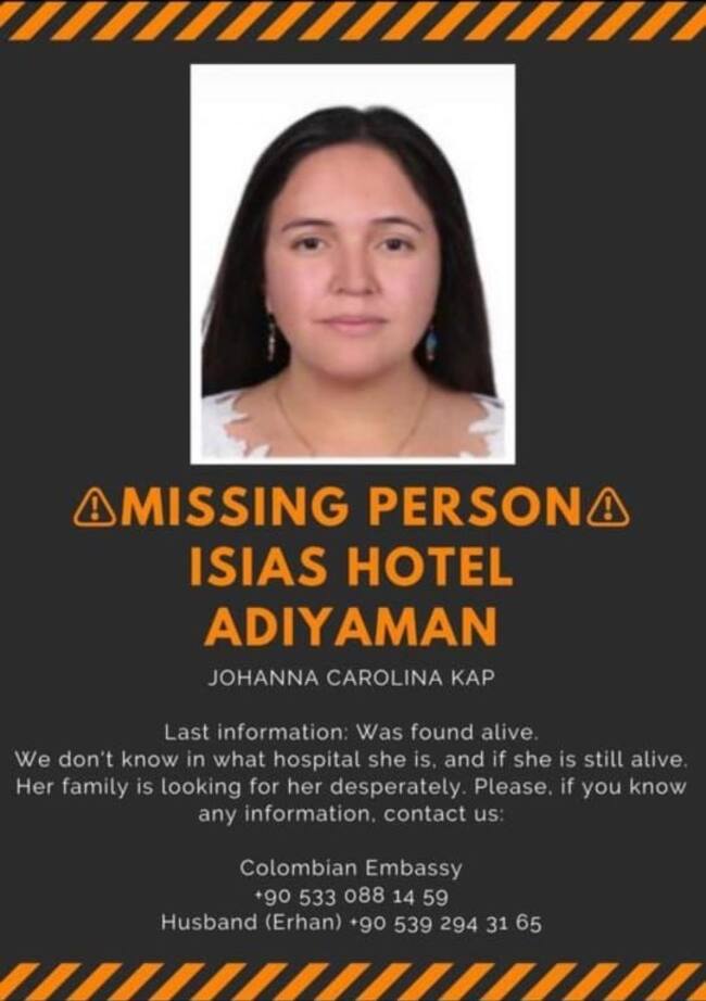 A través de un comunicado, el Ministerio de Relaciones Exteriores informó que luego de una búsqueda por diferentes hospitales y otros lugares de refugio, las autoridades en Turquía confirmaron que la colombiana Johanna Carolina Millán Velandia, falleció a causa de los terremotos que afectaron ese país.