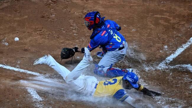 Vaqueros de Monteria, Dilson Herrera (3, en el suelo). Leones de Caracas, Francisco Arcia (8, de pie), durante partido de la Serie del Caribe. Foto: CORTEZ/AFP via Getty Images. / YURI CORTEZ