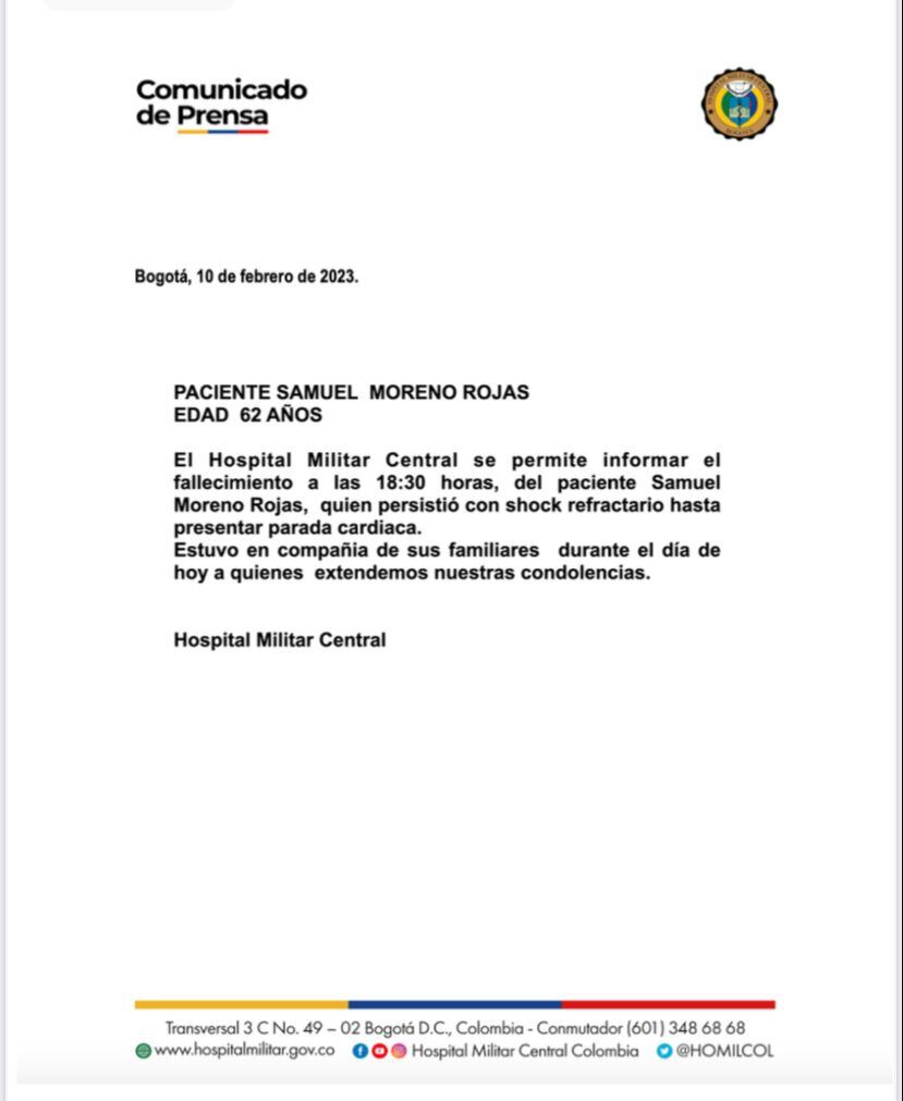 Este fue el comunicado del Hospital Militar con el que se confirmó la muerte de Samuel Moreno: