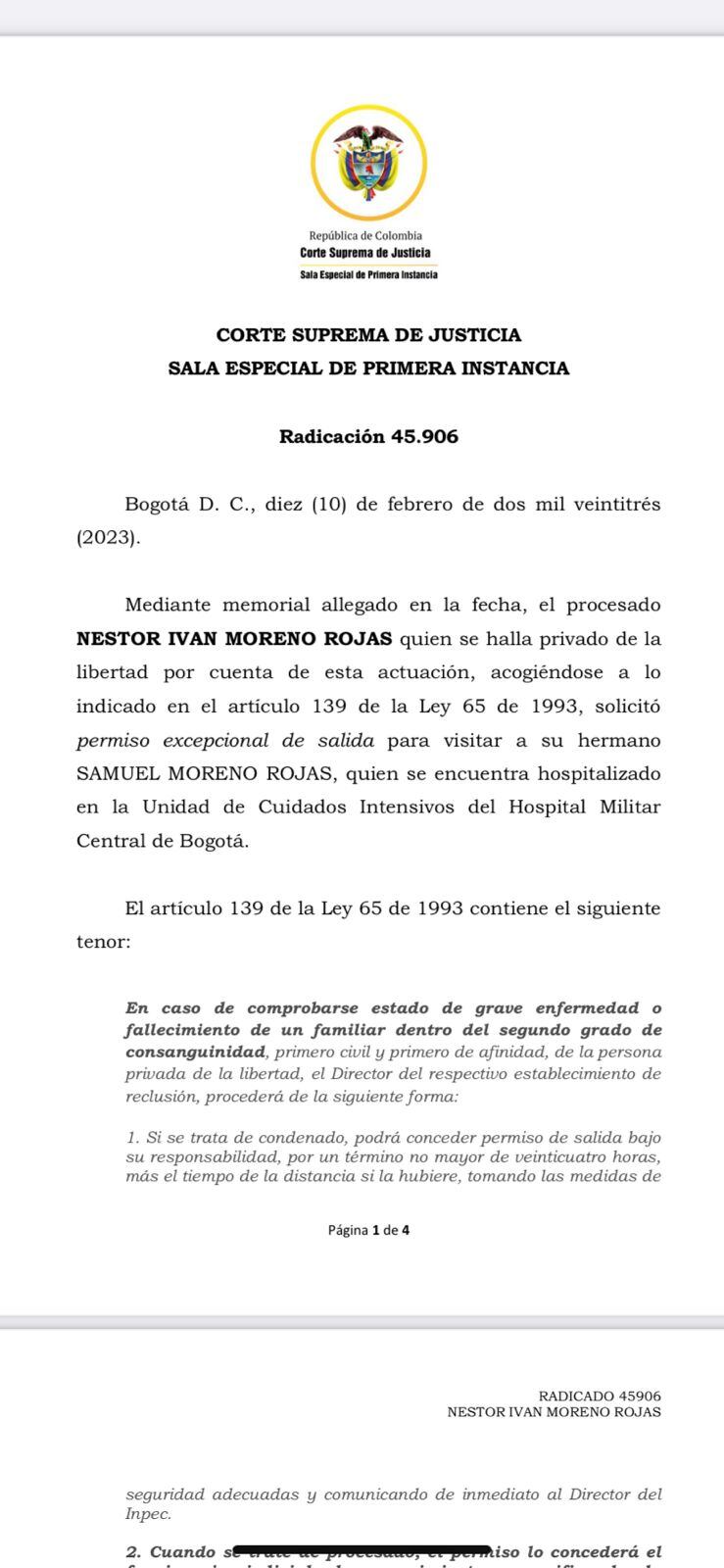 La Corte Suprema de Justicia le autorizó un permiso al hermano de Samuel Moreno, Iván Moreno, luego de que se conociera el estado crítico de su salud.