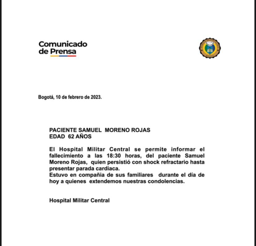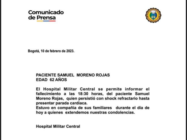 Comunicado fallecimiento Samuel Moreno. Foto: Hospital Militar Central