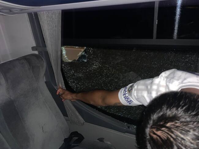 Bus de millonarios atacado con piedras. Ibagué 12 de febrero 2023. Foto: Cortesía.