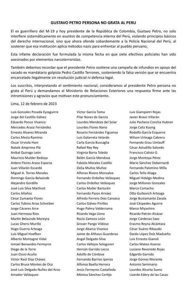 La canciller de Perú, Ana Cecilia Gervasi, aseguró que las calificaciones del presidente Gustavo Petro con respecto a la situación actual de ese país son “inaceptables”. Sobre las protestas y la crisis en Lima, Petro indicó que “en Perú marchan como nazis, contra su propio pueblo, rompiendo la Convención Americana de Derechos Humanos”, refiriéndose al papel de la Policía de ese país.