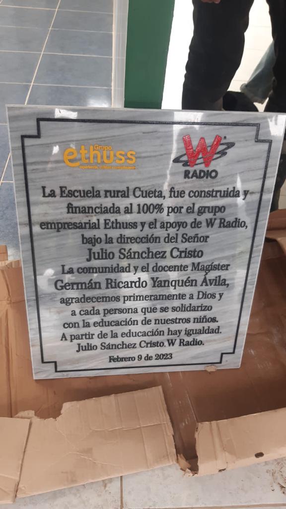“Queremos agradecer a Grupo Ethuss por contribuir a la educación en nuestra vereda (...) Hicimos una placa conmemorativa para honrar a W Radio y a Julio Sánchez Cristo”, expresó.