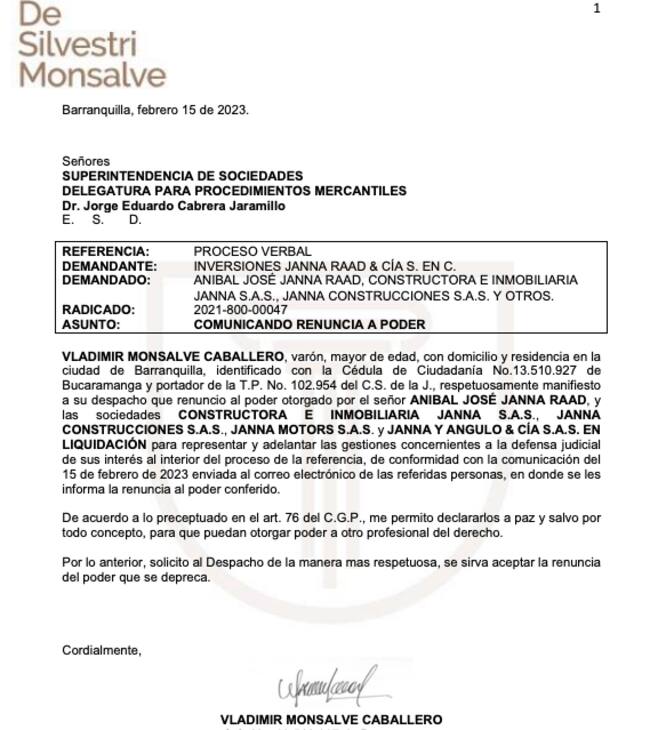 W Radio conoció en primicia que tras la denuncia que puso el empresario barranquillero Aníbal Janna, dueño de las empresas Constructora e Inmobiliaria Janna SAS y Janna Motors y distribuidor de carros Ford en la costa Caribe, contra el superintendente delegado para procedimientos mercantiles de la Superisociedades, Jorge Eduardo Cabrera, el abogado del empresario, Vladimir Monsalve Caballero, renunció.