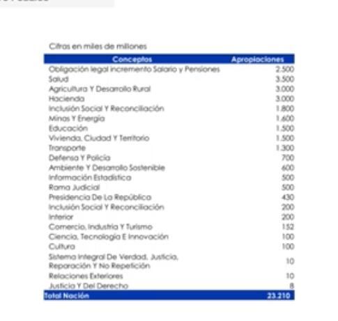 “En total se adicionan gastos en el PGN por $25,4 billones, de los cuales $23,2 son del Gobierno Nacional Central sin servicio de la deuda. La diferencia por $2,2 billones de gasto corresponden a los establecimientos públicos y se financia con recursos propios de estos como tasas, contribuciones y multas”, apuntó el Ministerio de Hacienda.