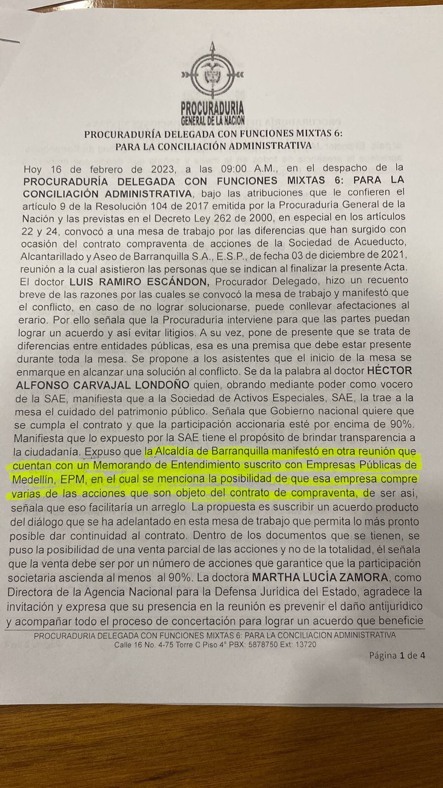 Ese mismo 10 de febrero, Luis Ramiro Escandón, la otra mano de la procuradora, citaba a las partes a una reunión el 16 de febrero para atender la queja del acalde de Barranquilla.